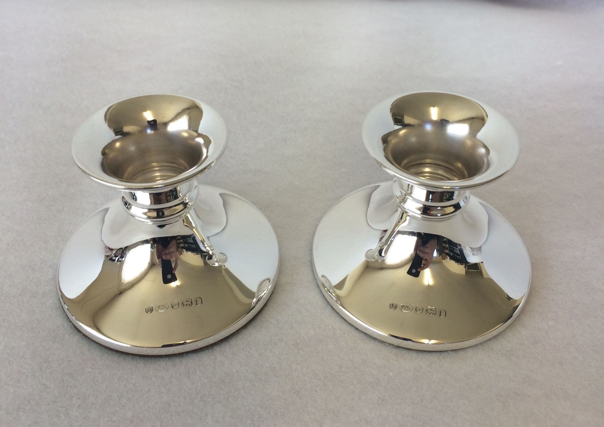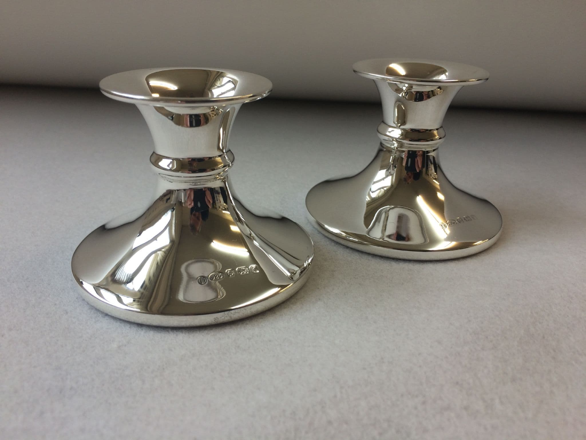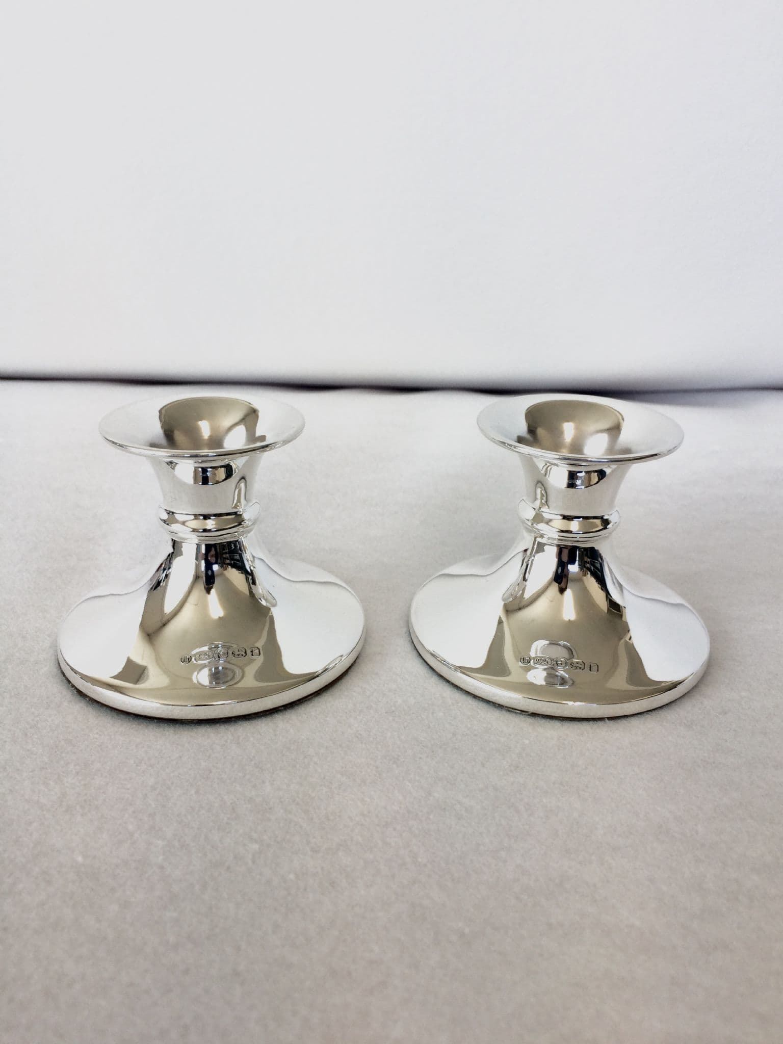 A pair of sterling silver mini Cabaret candlesticks design and made by Paul in our workshop.